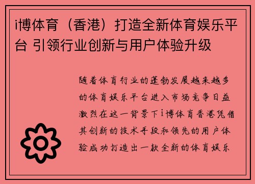 随着体育行业的蓬勃发展,越来越多的体育娱乐平台进入市场,竞争日益激烈。在这一背景下,i博体育(香港)凭借其创新的技术手段和领先的用户体验,成功打造出一款全新的体育娱乐平台,成为业内的亮眼新星。i博体育不仅关注传统体育赛事的直播和投注功能,更通过技术创新、智能分析、用户定制化体验等多维度手段,提升了用户的参与感和粘性。在这篇文章中,我们将从多个维度分析i博体育(香港)如何通过其平台创新,引领行业的发展,带来全新的体育娱乐平台体验。首先,我们将探讨平台在技术创新方面的突破;其次,分析其如何通过个性化和社交化的方式提升用户体验;接着,我们将讨论其在赛事内容丰富性上的扩展以及如何吸引全球用户;最后,我们将探讨其如何通过安全和合规性保障,构建用户信任。通过这四个方面的详细探讨,最终我们将总结出i博体育(香港)在体育娱乐平台行业中的领先优势。